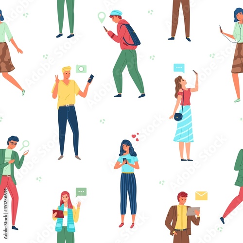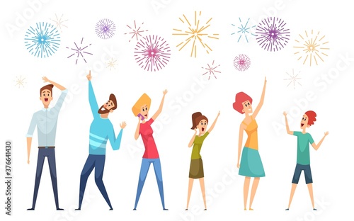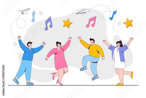 Merry Christmas party. Happy people celebrating flat vector poster. Greeting text and excited tiny character in festive Santa hat dancing and having fun illustration