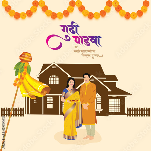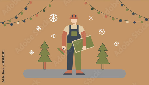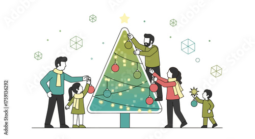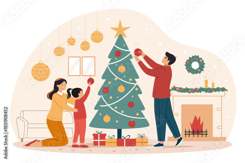 Merry Christmas scene. Happy couple decorating Christmas tree with toys and garland, flat vector illustration. Happy New Year. Winter holidays celebration.