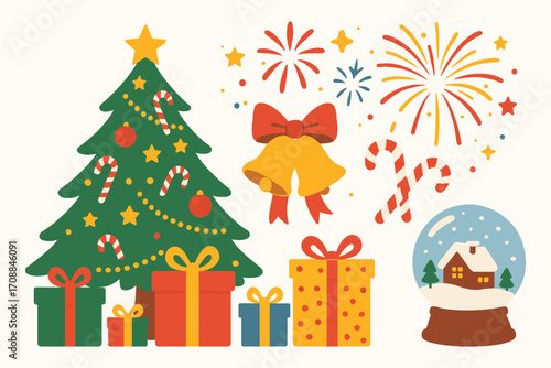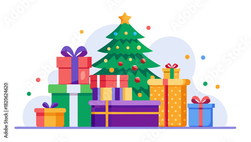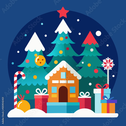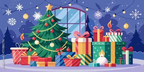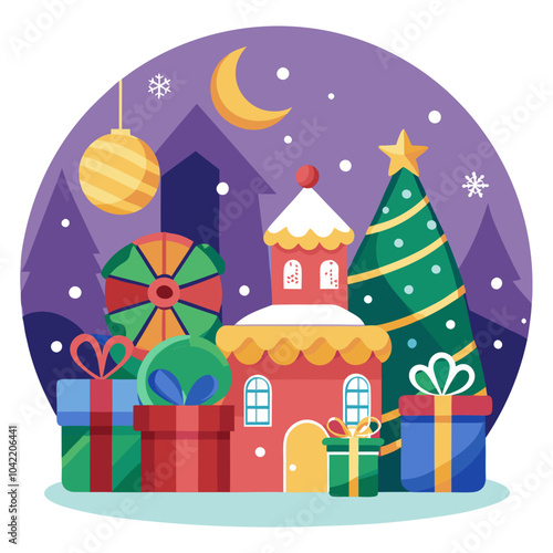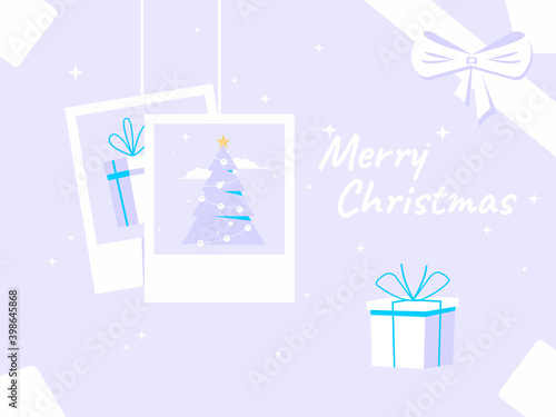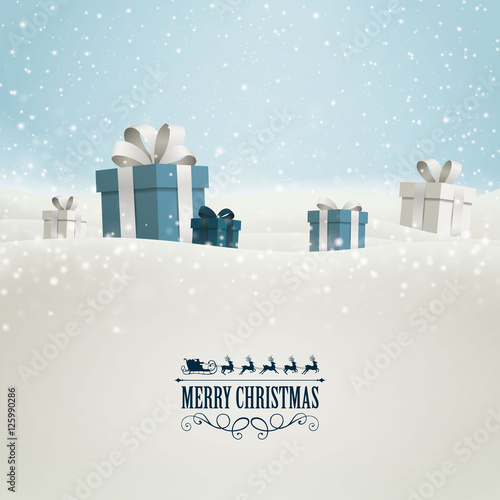 Merry Christmas scene, vector illustration. Gift box with ribbon and bow on display podium, paper cut winter background with deer silhouette.