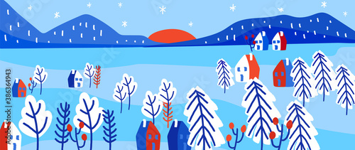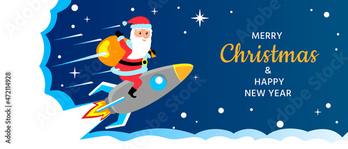 Merry Christmas vector website template, web page and landing page design for website and mobile site development. Paper cut Santa riding sleigh with reindeer, winter night landscape.