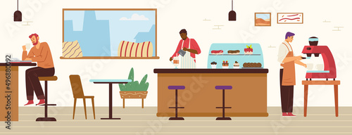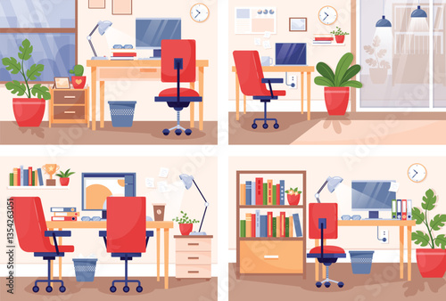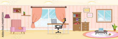 Messy bedroom with scattered stuff, flat vector illustration. Wardrobe full of clothes thrown disorderly. Scattered female clothing on sofa, on bed and on coffee table. Mess, disorder.