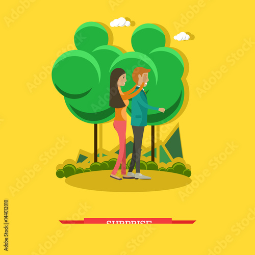 Milkmaid milking a cow, sitting on a stool under a fruit tree, metal bucket near. Cattle breeding, farming. Vector illustration in flat design