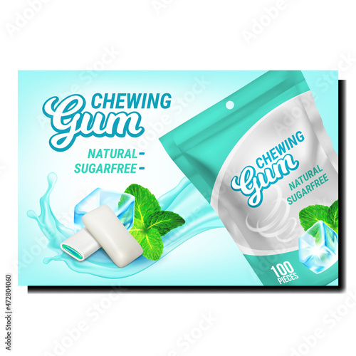 Vector realistic swirl of mint chewing gum pads and green mint leaves, bubblegum paper package design mockup, copy space, blue background. Pure mint and sugar free chewing gum ads.