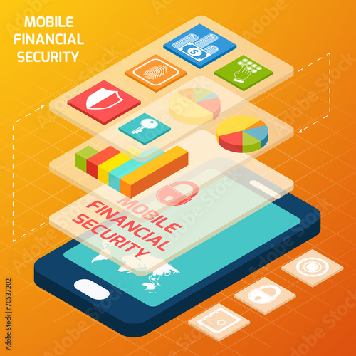 Mobile analytics concept vector flat isometric illustration. Smartphone with charts on screen. Process of monitoring and collecting the data that take place on mobile websites.