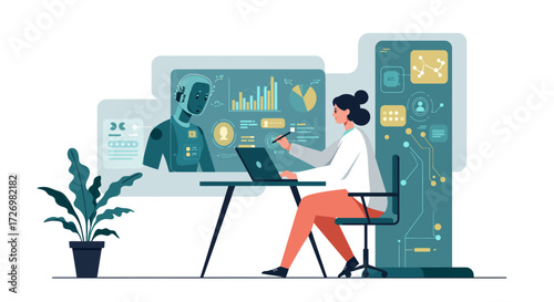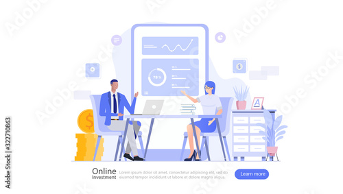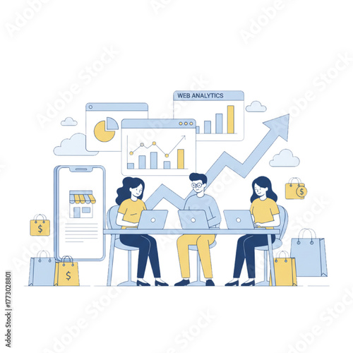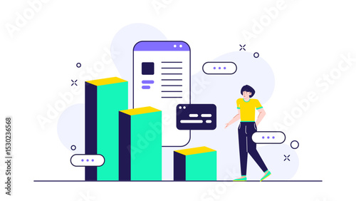 Mobile app development services, vector flat style design illustration. Big smartphone and tiny people creating software application for mobile device like doing jigsaw puzzle.