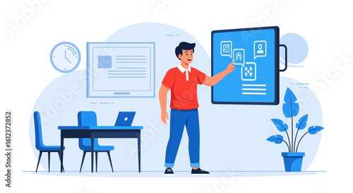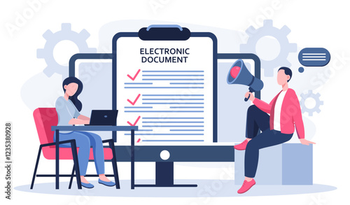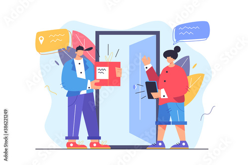 Mobile app development services, vector flat style design illustration. Tiny people software application developers building big smartphone user interface.