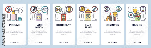 Mobile app onboarding screens. Bathroom accessories, mirror, hairbrush, washing powder, mouthwash. Menu vector banner template for website and mobile development. Web site design flat illustration.