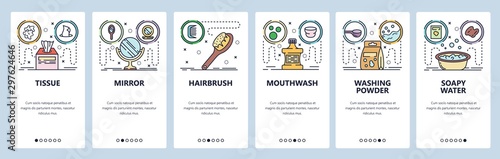 Mobile app onboarding screens. Different drink glasses for wine, cocktail, coffee, water. Menu vector banner template for website and mobile development. Web site design flat illustration.