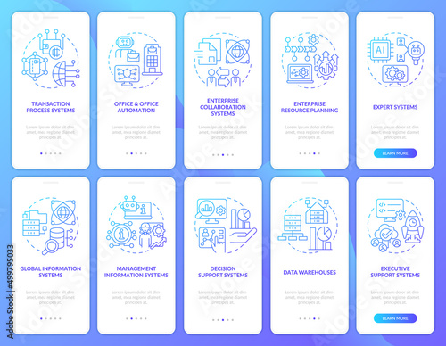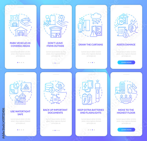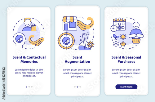 Mobile app onboarding screens. Morning routine, alarm clock, toothbrush, wash face, breakfast, dress up, office desk. Menu vector banner template for website and mobile development. Web site design flat illustration