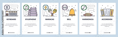 Mobile app onboarding screens. Musical instruments, keyboard, xylophone, maracas, harmonica, accordion. Menu vector banner template for website and mobile development. Web site design flat illustration.