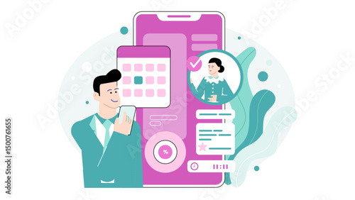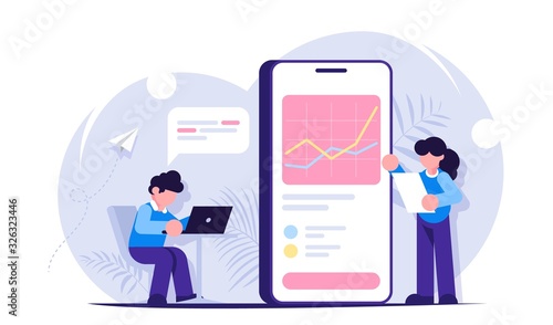 Vector illustration of big mobile phone with statistical dashboard on screen, light bulb and people shouting through megaphone, texting messages. Using mobile website, mobile app for business concept.