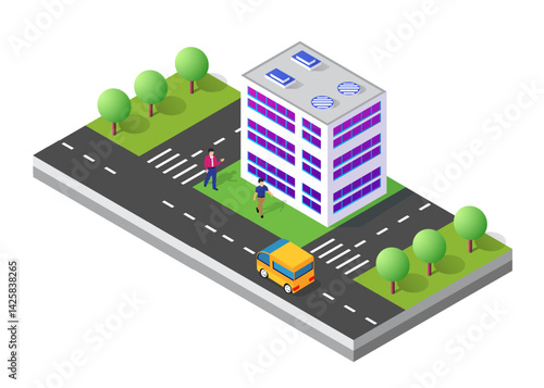 Mobile banking. Isometric bank building on smartphone screen, wallet, credit card, diagram, safe, gold, vector illustration. Online banking transactions, money transfer, bank deposit, internet payment