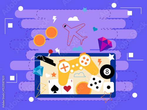 Mobile casino vector poster banner design template. Smartphone, roulette wheel, playing cards, slot game, poker chips, dice, golden dollar coins and trophy cup. Online casino concept.