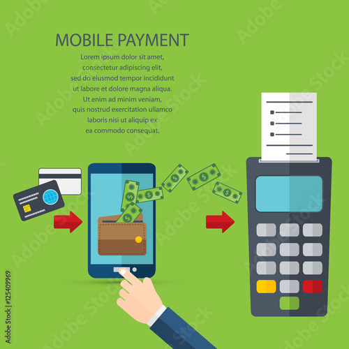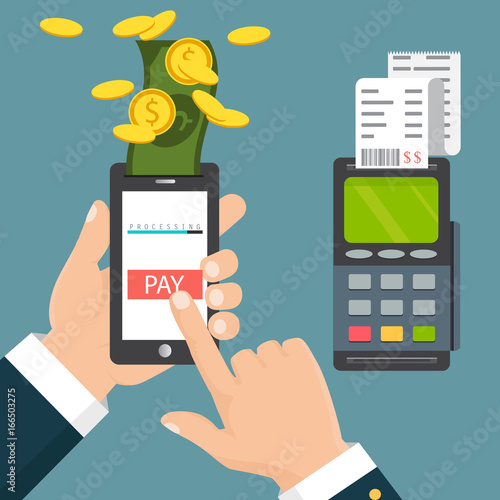 Mobile payments with smartphone. Near field communication payment terminal concept. Online transactions, paypass and NFC. Cartoon flat style vector illustration.