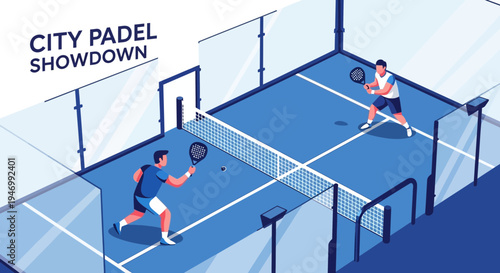Tennis mobile game, flat vector isometric illustration. Tennis court, players and scoreboard on smartphone screen. Online sport game competition.