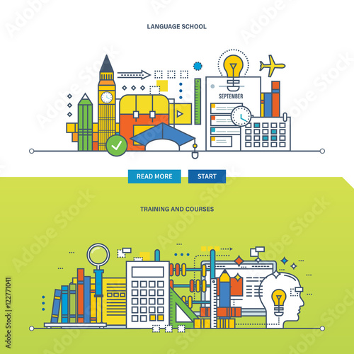 Modern cityscape vector illustration. City buildings set in flat style. Hospital, bistro, smart city and school. Colorful design