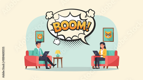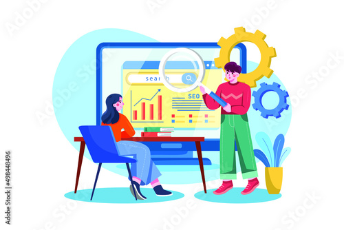 Vector illustration of young man and woman sitting on the bench using smartphone, tablet. Modern gadgets for daily life concept design element in flat style.