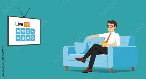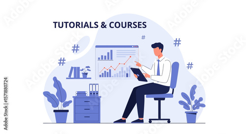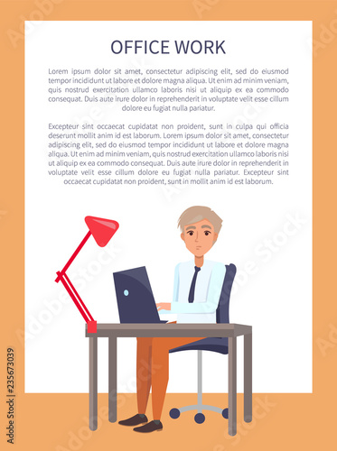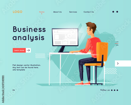 Vector illustration of office man, businessman working at the computer. Modern gadgets in business concept design element in flat style.