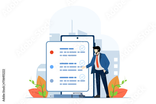 Vector illustration of tiny characters using huge tablet, earphones and smartphone. Modern gadgets, mobile digital devices concept for web banner, website page etc.