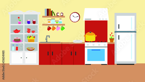 Modern kitchen interior. Vector illustration in flat style. Room furniture, oven.