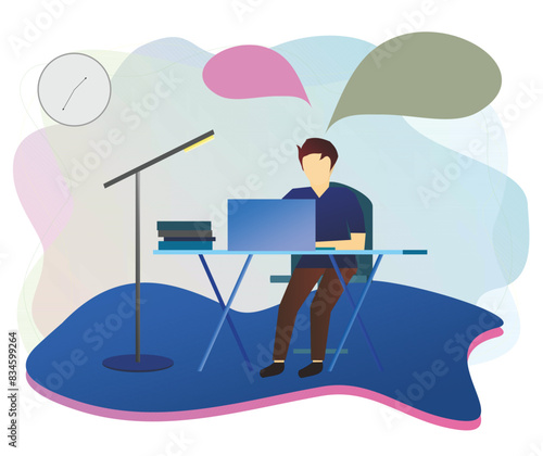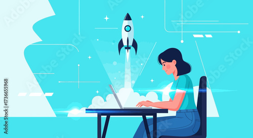 Modern office workspace. Happy girl working at office desk while sitting on bright pink color ottoman, flat vector illustration. Business workplace comfortable seating solution.