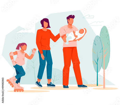 Two women mothers with their kids talking to each other, vector flat style design illustration. Young moms walking, taking rest, chatting in the park.
