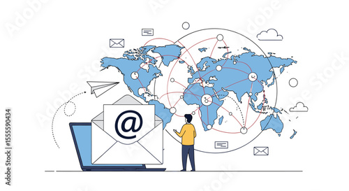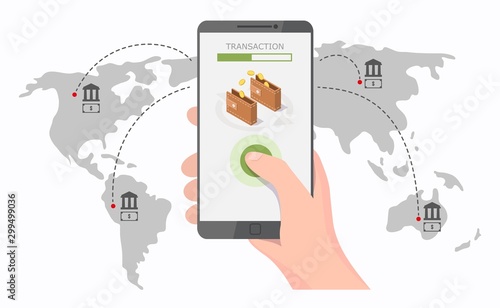 World map, hand holding smartphone with worldwide money transfer app, vector flat illustration. Global online payments, mobile banking and mobile transactions concept.