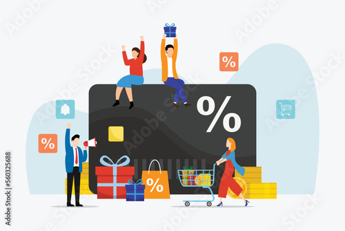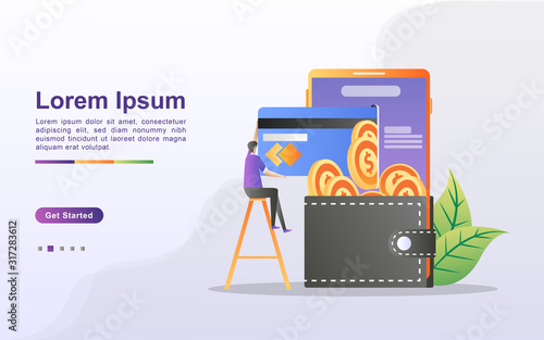 Money transfer service, vector flat illustration. Big bank card and tiny people with dollar coin and banknote. Send and receive money online, internet banking concept for web banner, website page etc.