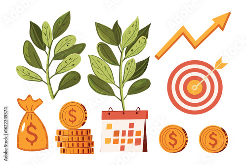 Money tree, gold bars, money bags, arrow chart, flat vector isometric illustration. Investment in gold concept.