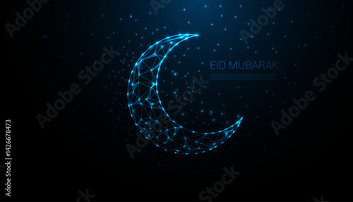 Vector polygonal art style night sky with crescent moon and clouds. Low poly wireframe mesh with scattered particles and light effects on dark blue background. Greeting card poster banner template.