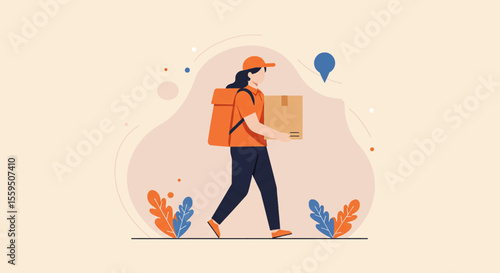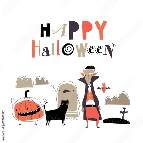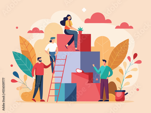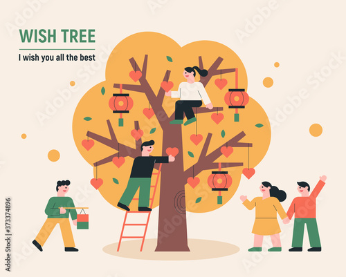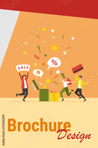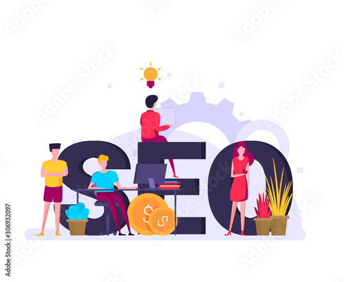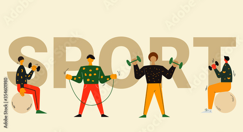Morning coffee concept vector illustration. People buy coffee in small cafe. Big coffee sign.