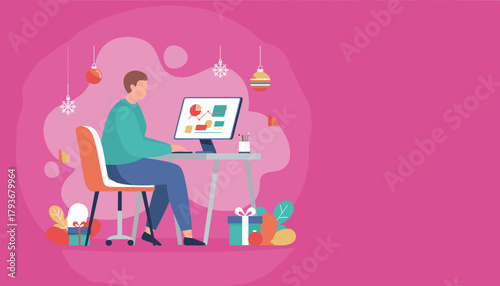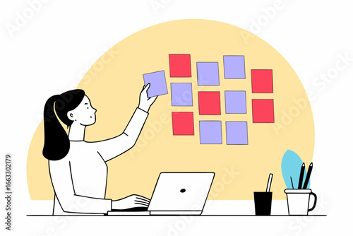 Mother boss with laptop in one hand and baby bottle in the other, flat vector illustration. Business woman taking care of baby and working from home. Work life balance.