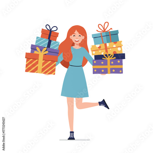 Mother presenting lots of wrapped gift box to little girl daughter vector illustration. Happy kids birthday congratulation, festive event celebration and family loving relations concept