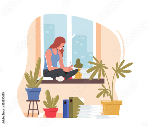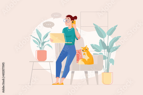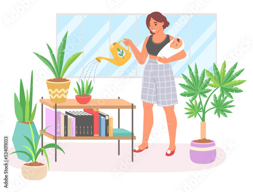 Mother with newborn baby flat vector. Mum holding new born kid and watering home flower illustration. Maternity, motherhood and happy family daily routine