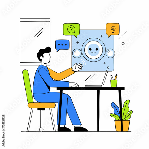 Motion designer animator working on computer creating animated video while sitting at desk, vector flat isometric illustration. Motion graphic studio services concept for web banner, website page etc.