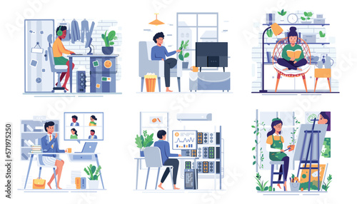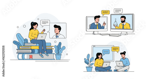 Moto driving school vector scene. Student study on lesson, learn rules traffic regulations, pass exam. Motorcyclist getting license. Isolated flat set