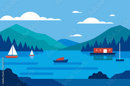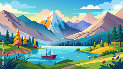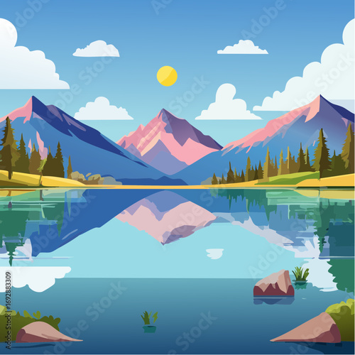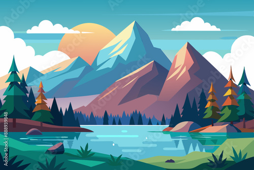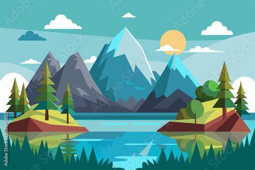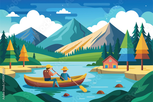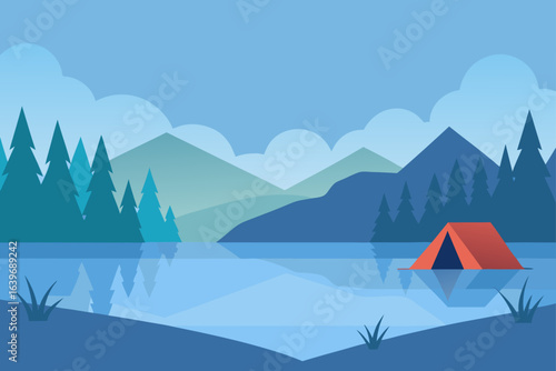 Summer camping poster template, vector illustration in paper art style. Mountain campsite, hiking, trekking concept with forest, mountains, river, campfire and tent.
