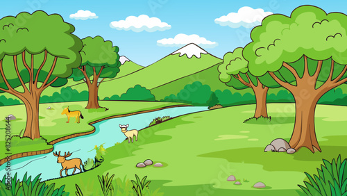 Mountain forest cartoon nature vector background. Green grasslands meadow with trees and bushes. Beautiful landscape illustration