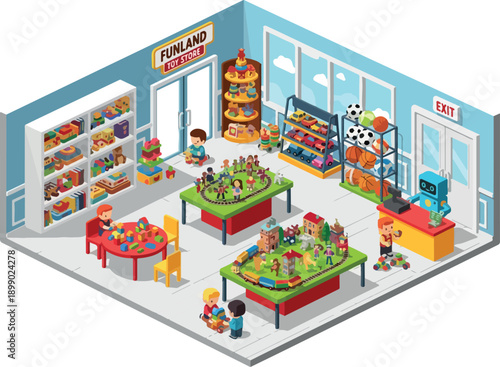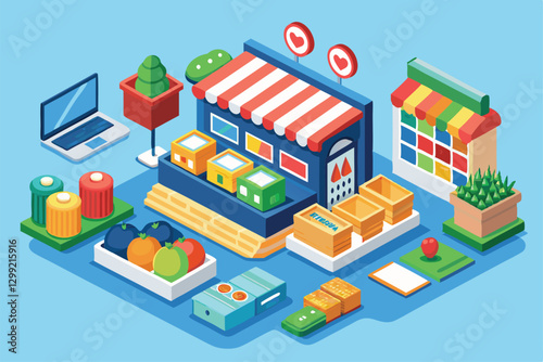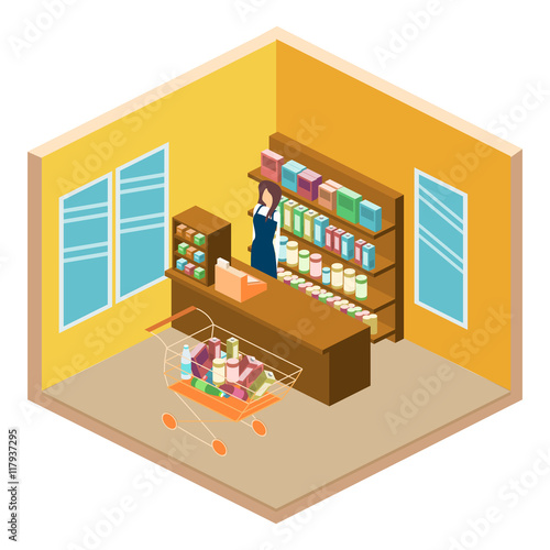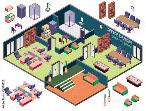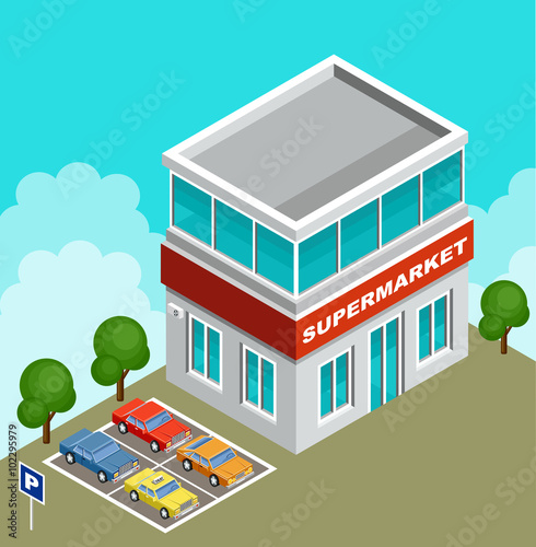 Movie theater building in isometric style design. Vector flat 3d icons. Interior of cinema, cafe, ticket office.