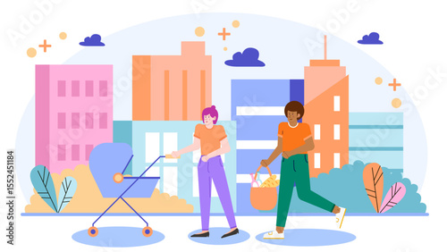 Loaders carrying cardboard boxes and sofa with man and cat sitting on it, vector flat style design illustration. Moving house, relocation service concept for web banner, website page etc.