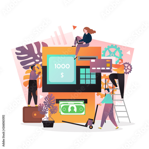 Loaders movers loading house into moving truck, pushing cart with cardboard boxes, vector illustration. Moving home transport company services concept for web banner, website page etc.