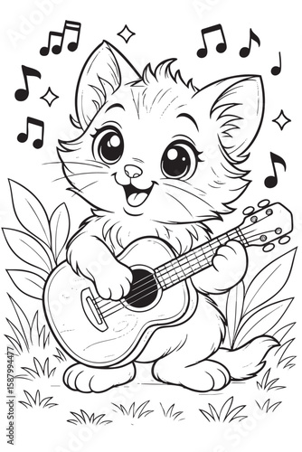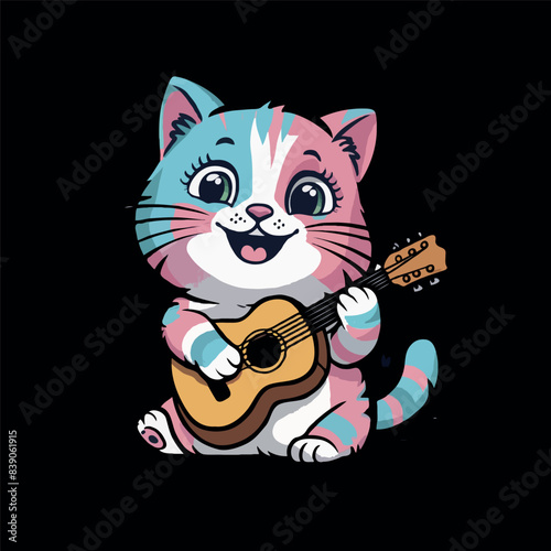 Cat playing guitar vector. Music animal character cartoon icon. Cute Kitten rockstar guitarist performance isolated on white background