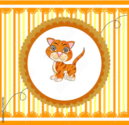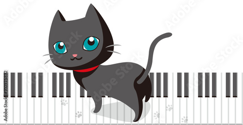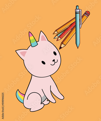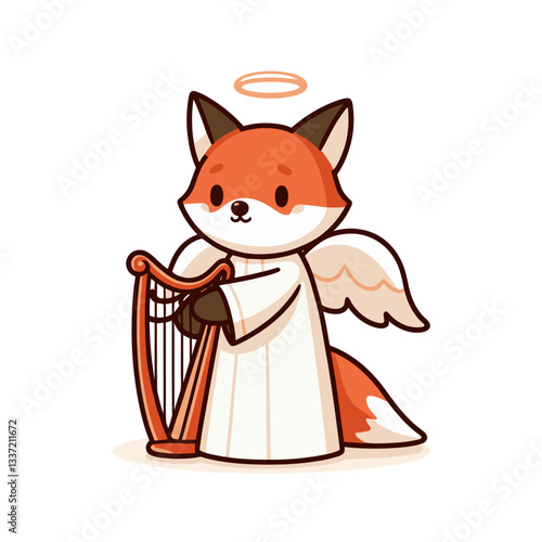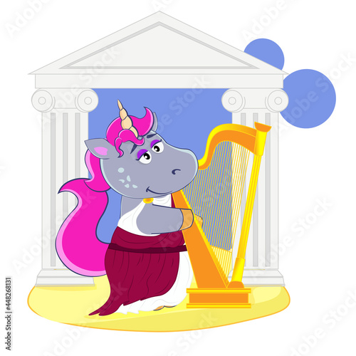 Music cat playing harp vector. Cartoon funny pet animal character musician icon. Kitten giving musical performance isolated on white background