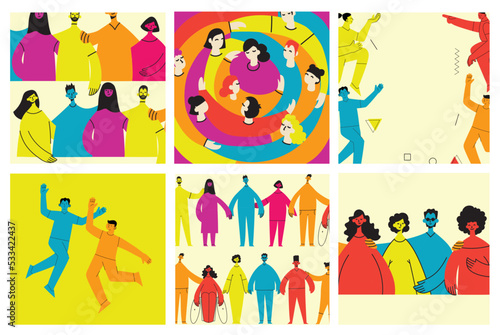 Music festival vector poster banner template with musicians color cartoon characters playing saxophone, guitar, double bass, french horn, trumpet, violin and trombone.