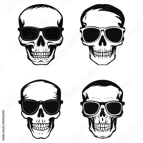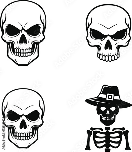 Music skull front view set, vector hand drawn illustration isolated on white background. Human skull with iroquois, beard, wearing hat and cap listening to music using headphones.