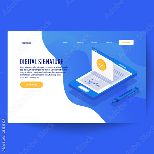 Music subscription services landing page website template. Vector isometric smartphone with headphones, treble clef and notes, subscription button.