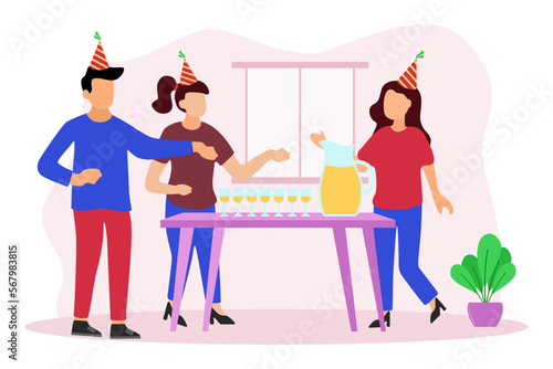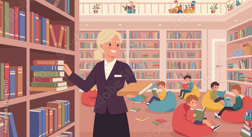 Happy muslim women in perfume store, flat vector illustration. Arab girls in traditional clothing, hijab with shopping bags. Perfumery, department store interior with shelves full of perfume bottles.