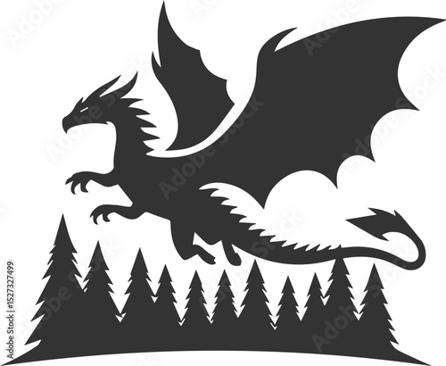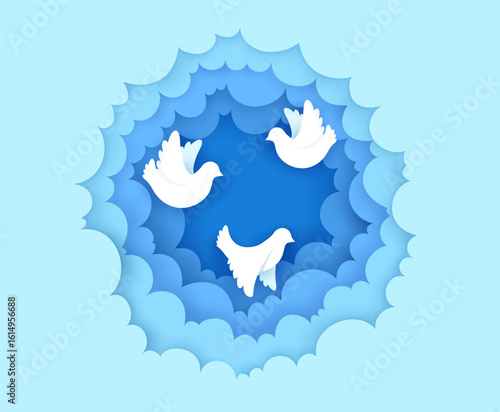 Vector layered paper cut style fluffy clouds and mythological Pegasus, winged horse silhouette. Beautiful fairytale composition.