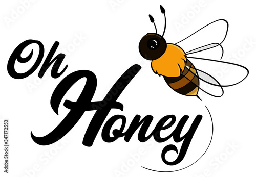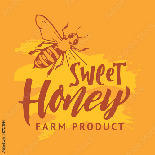 Natural honey icon. Vector sticker, label or logo with dripping headline text, bee and sweet nectar honeycomb cell design isolated on white background