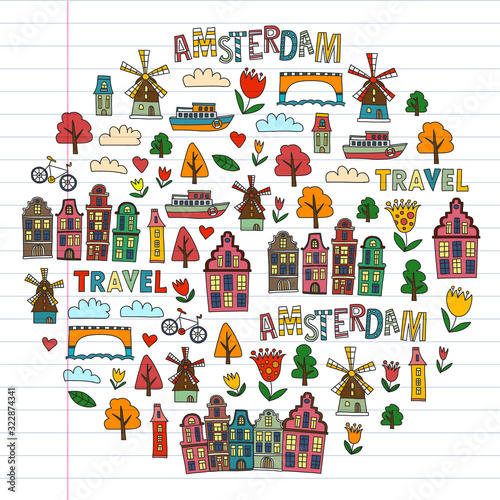 Netherlands symbolics and holland travel icons isolated set. Vector illustration of amsterdam architecture building, famous tourists landmarks, map, traditional food and national flag